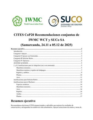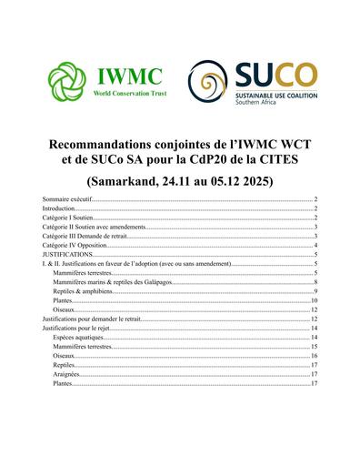 Documents Home » CITES » CiTES CoP20 » CITES CoP20 Joint Recommendations » September 4, 2025 Folder September 4, 2025 Home » CITES » CiTES CoP20 » CITES CoP20 Joint Recommendations » September 4, 2025 » CITES CoP20 Joint Recommendations IWMC WCT and SUCo SA – English pdf CITES CoP20 Joint Recommendations IWMC WCT and SUCo SA – English Published on 04 September 2025 Modified on 08 September 2025 By admin 1254 downloads Download (pdf, 647 KB) CITES CoP20 Joint Recommendations IWMC WCT and SUCo SA.docx.pdf-2025-9-4 18.9.14.pdf Home » CITES » CiTES CoP20 » CITES CoP20 Joint Recommendations » September 4, 2025 » Recomendaciones conjuntas de IWMC WCT y SUCo SA – Español pdf Recomendaciones conjuntas de IWMC WCT y SUCo SA – Español Published on 04 September 2025 Modified on 08 September 2025 By admin 614 downloads Download (pdf, 587 KB) Recomendaciones conjuntas de IWMC WCT y SUCo SA.docx.pdf-2025-9-4 18.13.40.pdf Home » CITES » CiTES CoP20 » CITES CoP20 Joint Recommendations » September 4, 2025 » Recommandations conjointes de l’IWMC WCT et de SUCo SA – Français pdf Recommandations conjointes de l’IWMC WCT et de SUCo SA – Français Published on 04 September 2025 Modified on 08 September 2025 By admin 604 downloads Download (pdf, 604 KB) Recommandations conjointes de l’IWMC WCT et de SUCo SA .docx.pdf-2025-9-4 18.12.28.pdf